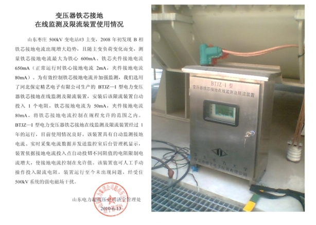 山東省棗莊500KV變電站安裝運(yùn)行變壓器鐵芯接地在線(xiàn)監(jiān)測(cè)及限流裝置
